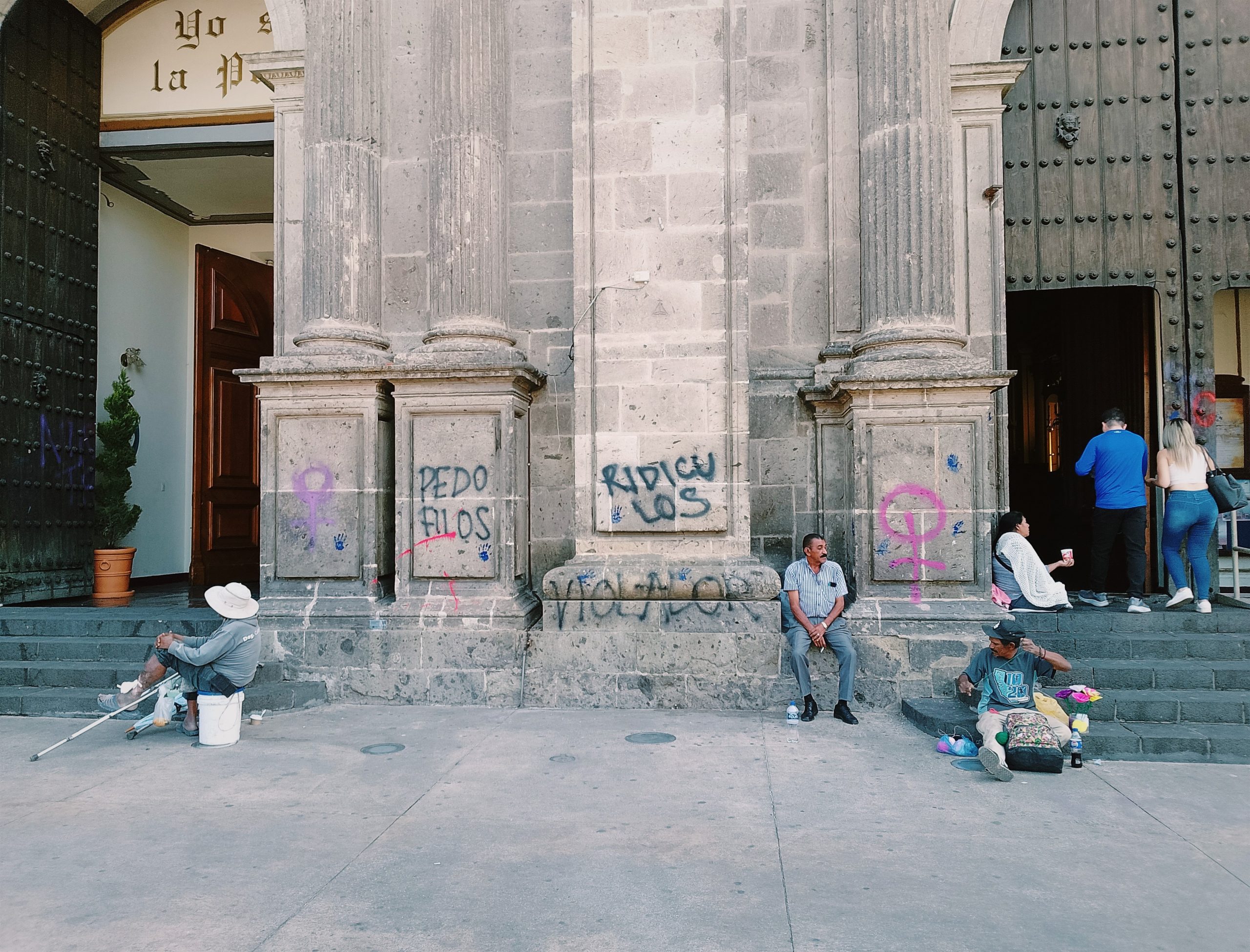 Algunos edificios emblemáticos e históricos llenos de consignas y stencils. Mensajes como “Pedófilos”, “Ridículos” y “Violadores”, resaltaban en los muros del Sagrario y la Catedral, y contrastaban con la cotidianidad de las personas que descansaban bajo su sombra, hacían fila para recorrerlos por dentro o que se postraban frente sus puertas pidiendo dinero. Finalmente, cerramos el recorrido en el kiosco de la Plaza de Armas, donde realizamos carteles con mensajes y preguntas que sirvieron para decorar el perímetro de la estructura de metal, con miras a apropiarnos del espacio en preparación para la vigilia que tendría lugar ese mismo día ante los descubrimientos recientes del Rancho Izaguirre en Teuchitlán.