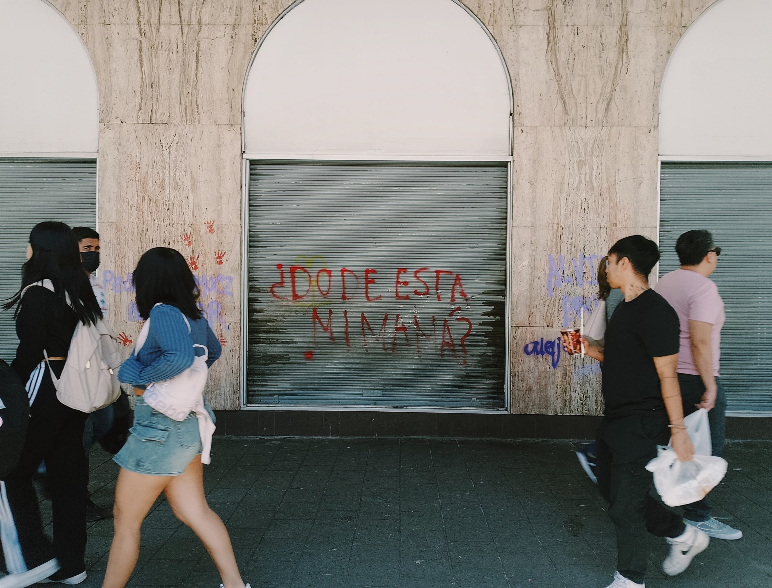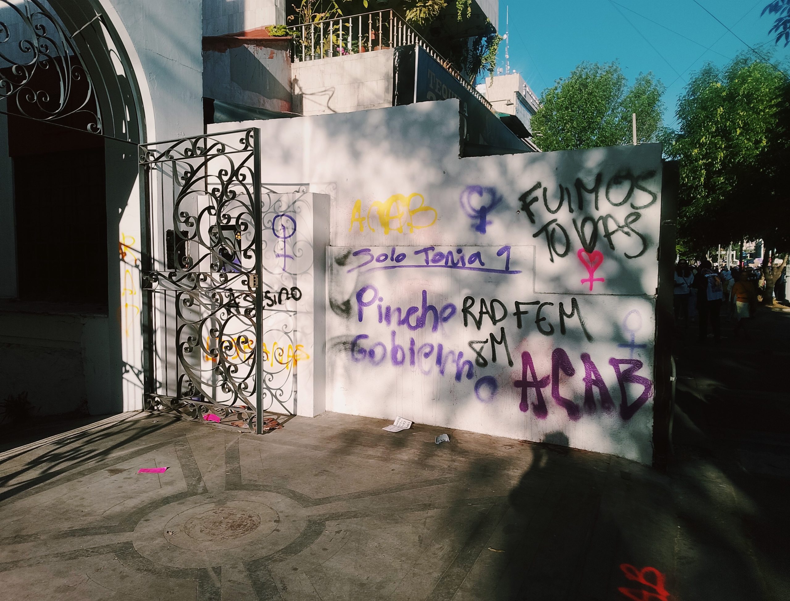Desde el inicio fue posible observar las intervenciones sobre el espacio, aunque éstas variaban en tamaño, forma e impacto. Transnacionales como KFC, McDonald’s o BBVA, que se vieron altamente afectados al finalizar la marcha de una semana antes, en el momento se encontraban como si nada, mientras que otros comercios seguían presentando las marcas de la marea violeta. Lo anterior fue tema de curiosidad y discusión, ¿por qué hay negocios que ya recuperaron sus fachadas y otros que no? Cuando sugerí que le preguntáramos a las personas de los comercios, muchas me miraron espantadas: olvidé por un instante que yo era la única antropóloga. Después de indagar un poco, supimos que la única razón por la que las pintas seguían en sus fachadas es porque el Ayuntamiento no se había encargado de limpiar y pintar inmediatamente como todos los años; “ya se están tardando”.