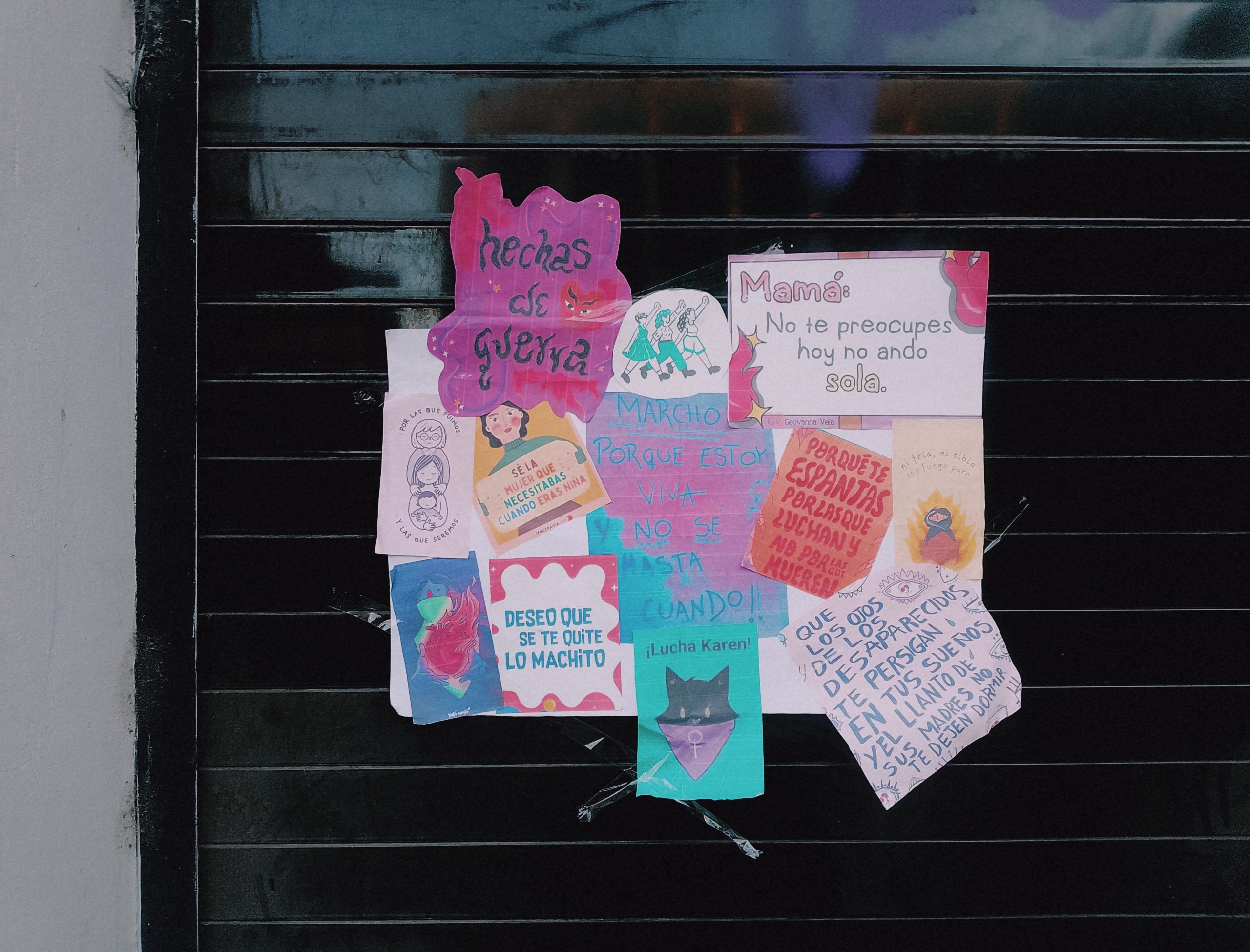 Como en años anteriores y en otros contextos, el paso de la marcha dejó grabados en banquetas, paredes, árboles, postes y otras superficies los nombres de agresores sexuales y violentadores y de mujeres desaparecidas y/o víctimas de feminicidio, consignas feministas, mensajes con peso político como el A.C.A.B. (All Cops Are Bastards), y denuncias de distintos tipos de violencia ejercida contra las mujeres.