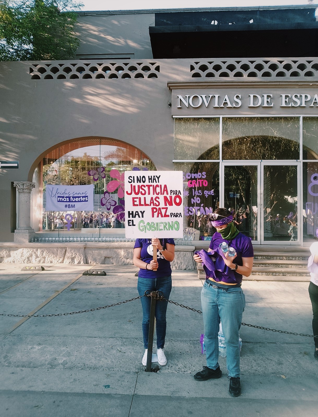 Las estrategias utilizadas oscilaban entre: 1) incluir mensajes de apoyo (en forma de mantas, moños morados o escritura sobre los vidrios); 2) poner paneles cubriendo sus fachadas y, mi favorita, 3) poner a sus trabajadoras afuera de los negocios, con montajes para la repartición de bebidas o solamente con letreros y pañoletas en alto.