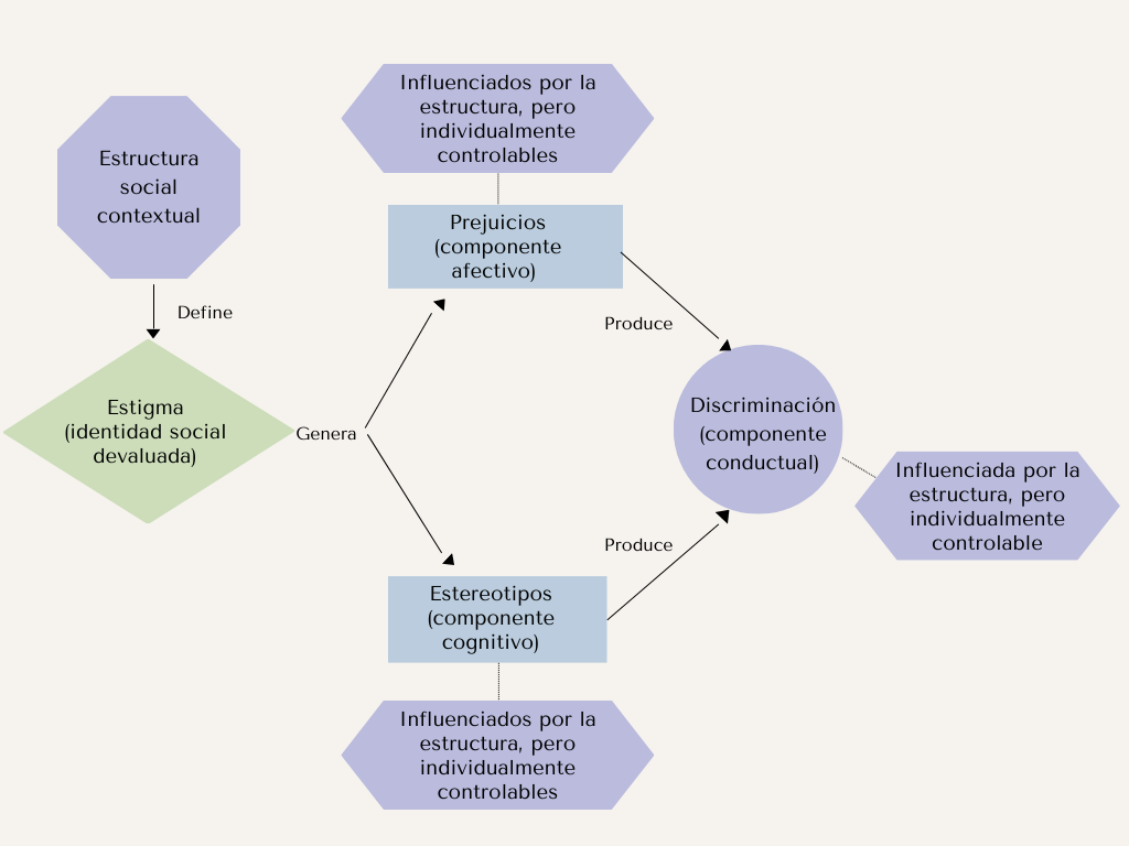 Del argumento causal propuesto se desprende que el estigma está definido de acuerdo con un contexto dentro de una estructura social. Dicho estigma despierta prejuicios inscritos en un componente afectivo y estereotipos pertenecientes a un componente cognitivo (Fiske, 1998), pero esencialmente determinados por el contexto de la estructura social —aunque no por ello incontrolables—. Dichas categorizaciones producen discriminación, que corresponde al componente conductual de la ecuación, la cual es una respuesta defensiva endogrupal como consecuencia de la percepción de riesgo o amenaza frente a un extraño o diferente.
