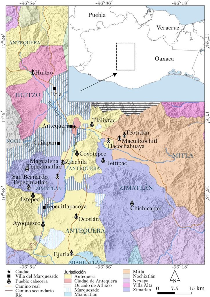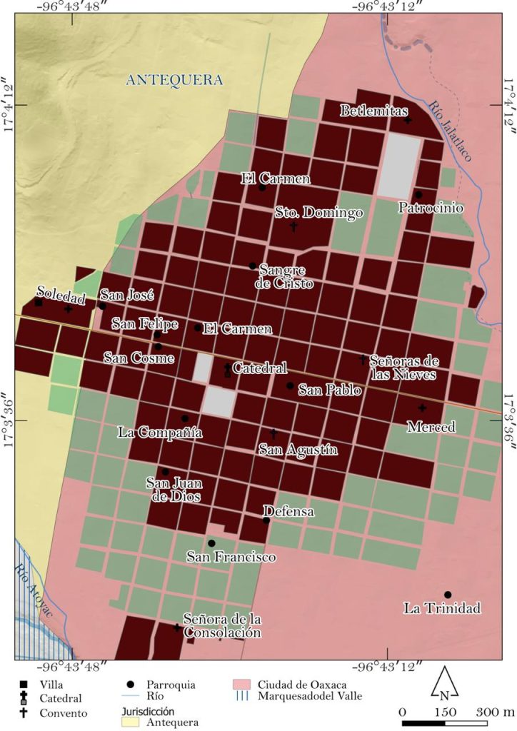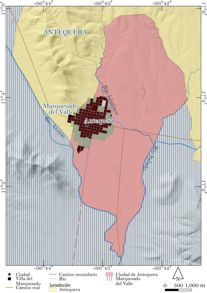 Una de las características distintivas de la urbe antequerana fue su localización estratégica, delimitada por barreras naturales: los ríos Atoyac, Salado y Jalatlaco, así como por el cerro del Fortín. Además, colindaba con las propiedades del Marquesado del Valle y con la jurisdicción de diversos pueblos de indios. Por ello, resulta fundamental considerar tanto los factores ambientales como los políticos en el análisis de su configuración territorial, ya que la ciudad quedó circunscrita a un espacio acotado dentro de los Valles Centrales de Oaxaca.