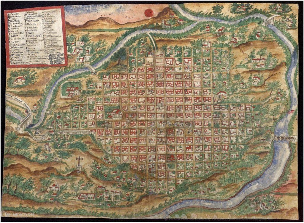 Su descripción iba acompañada de un pequeño “planisferio”, donde el fraile capuchino muestra una ciudad nucleada, con aproximadamente 90 manzanas y que delimitaba sus puntos de interés por mojoneras religiosas (los conventos e iglesias):