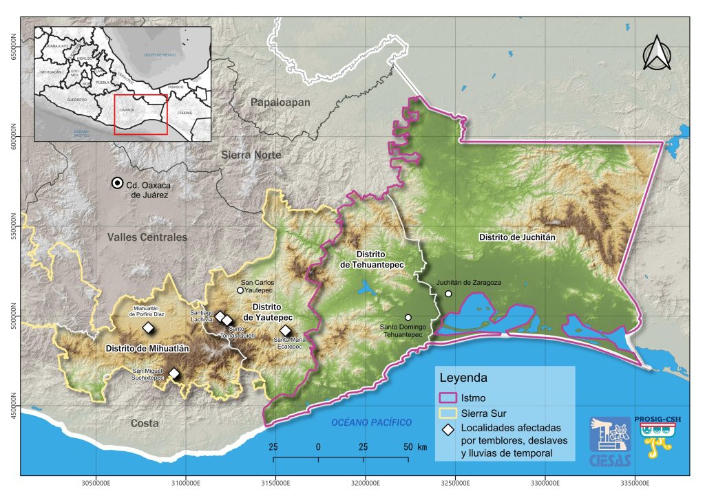 Fuentes: INEGI, Marco Geoestadístico Nacional 2020; SRTM Downloader (Modelo Digital de Elevación); datos de Olivia Topete; digitalización propia con base en el portal oficial del Gobierno del Estado de Oaxaca. Elaborado por Carlos A. Hernández Guillén. Programa Especial de Sistemas de Información Geográfica para Ciencias Sociales y Humanidades (ProSIG-CSH), mayo, 2025.